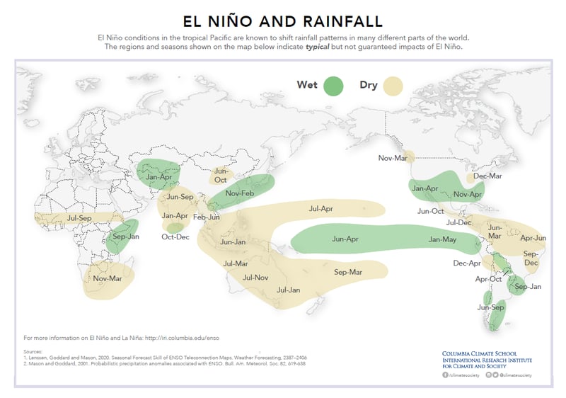 El Niño or La Niña conditions do not just affect local regions; their impacts are global. During El Niño, the southern United States might see increased rainfall, while Australia could become drier. Conversely, La Niña can lead to drier conditions in the south of the U.S. and wetter conditions in parts of the Caribbean and Australia. The graphics below show that regardless of El Niño or La Niña conditions, their influence can be far-reaching.